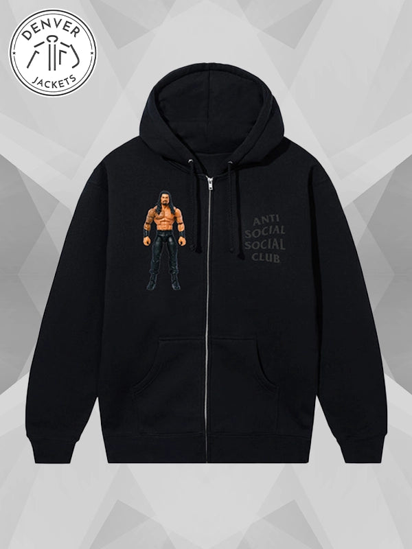 ASSC x WWE Roman Reigns Hoodie – zip-up features an action-figure silhouette of Roman Reigns at the left chest and a WWE icon on the back, right above Anti Social Social Club insignia, which adds a WWE persona through your clothing.