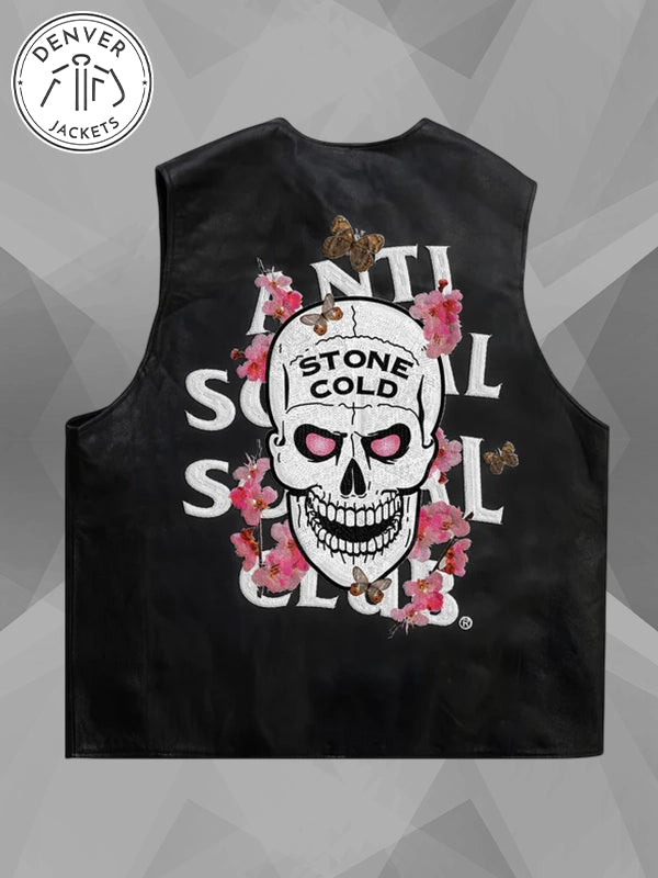 Re-Creation | ASSC Anti Social Social Club x WWE Stone Cold Embroidered Black Leather Vest