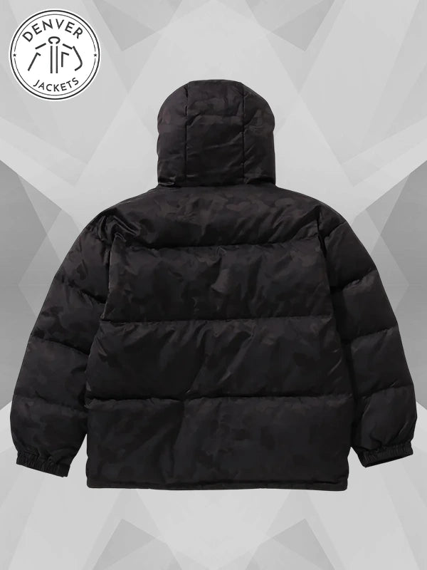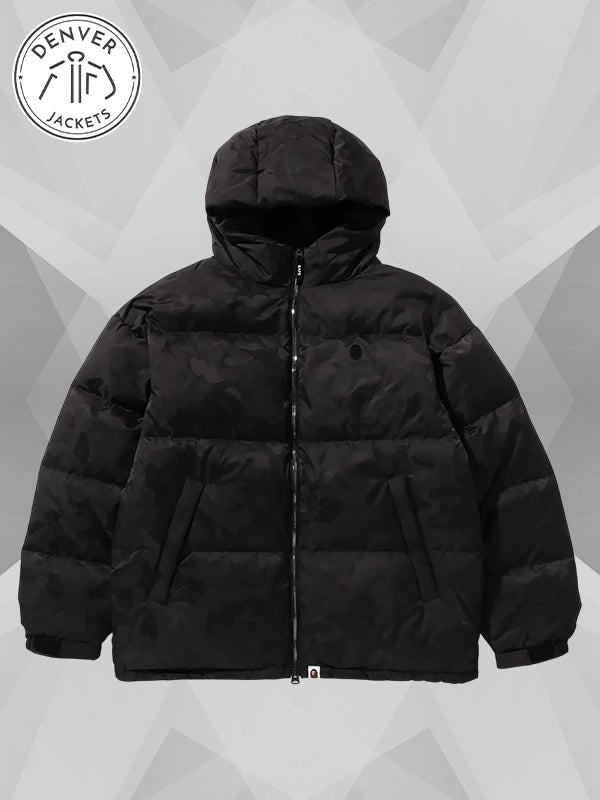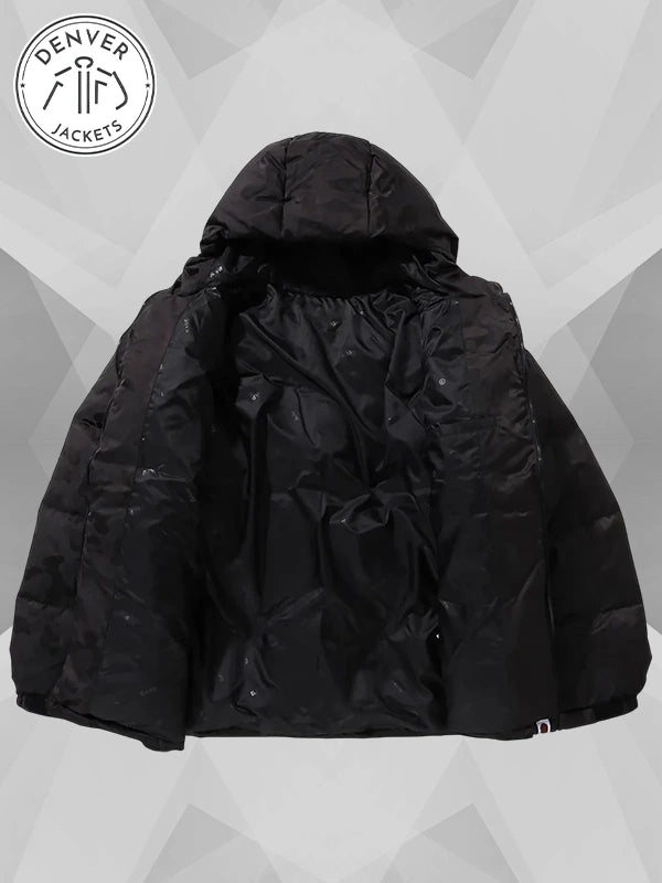 The BAPE Solid Camo Jacquard Puffer Jacket Black is the perfect excuse for a half-sleeve plain shirt to move over beneath it.