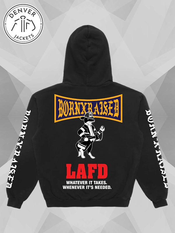 “WHATEVER IT TAKES, WHENEVER IT’S NEEDED”. The legendary label Born x Raised has officially collaborated with the Los Angeles Fire Department for you to cool off and dress emphatically. Here to make your day is Denver Jackets, an outerwear store that has been working with your size and wallet since day one! Order Born X Raised Lafd Snooty Hoodie Black now.