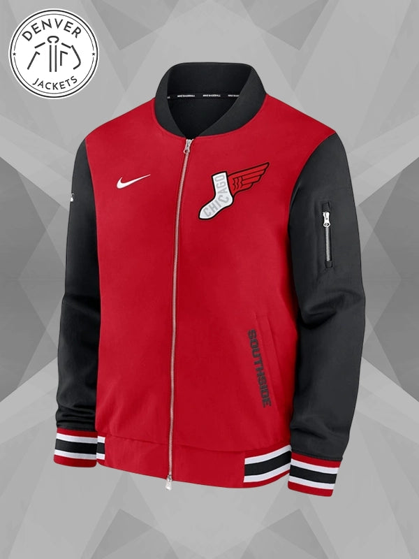 Our Chicago White Sox City Bomber Jacket red/black colorway is a full-zip bomber jacket because White Sox rules the airspace of the playfield, baby! With sweet team graphics, a spectacular colorway and a zippered sleeve on the left, the stakes couldn’t get any higher.