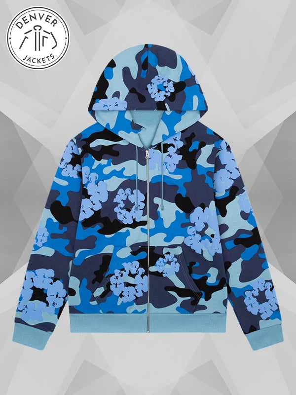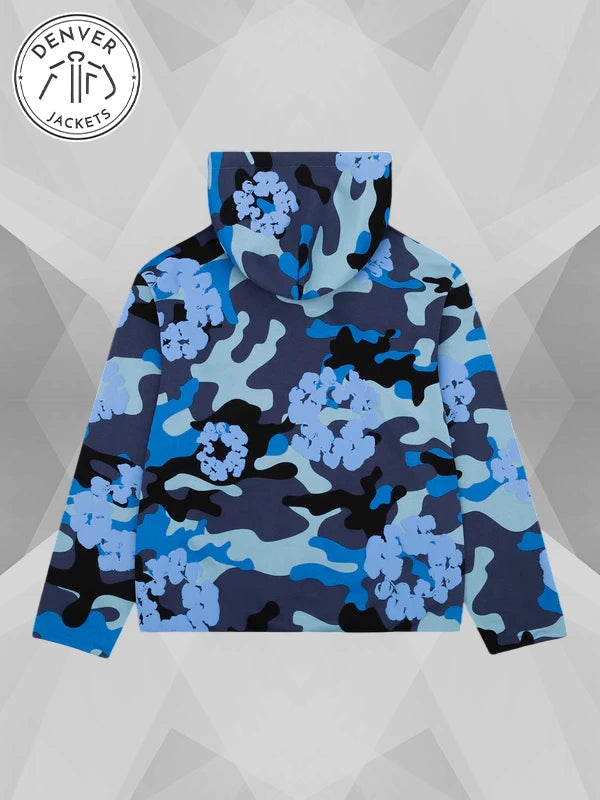 Get ready to make a grand entrance in the rich streets of the vogue-ville with the Denim Tears Blue Camo Cotton Wreath Zip-up Hoodie. It will surely bring a smile to your face and add an overwhelming flavor to the place. Own this now. Order it from Denver Jackets.