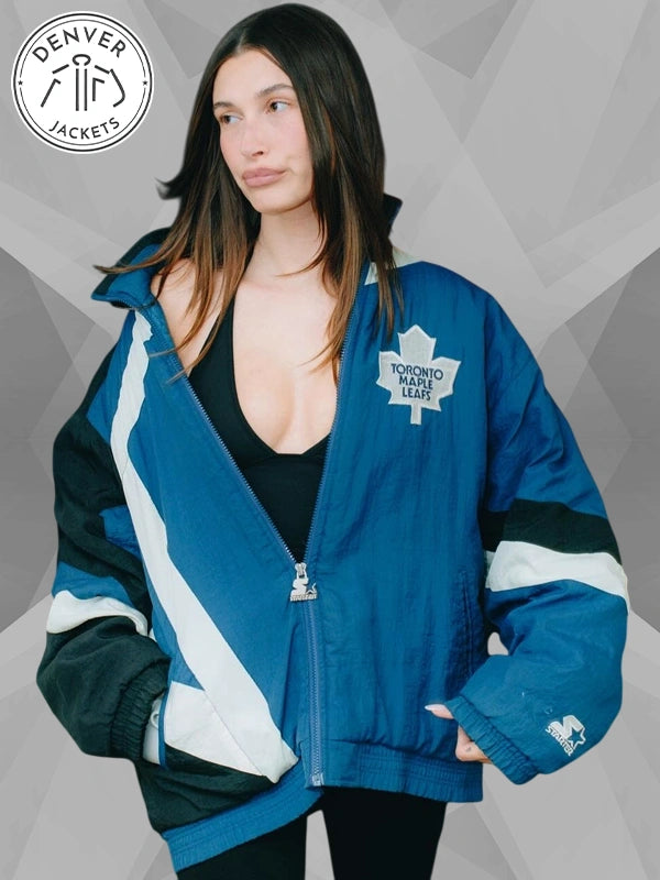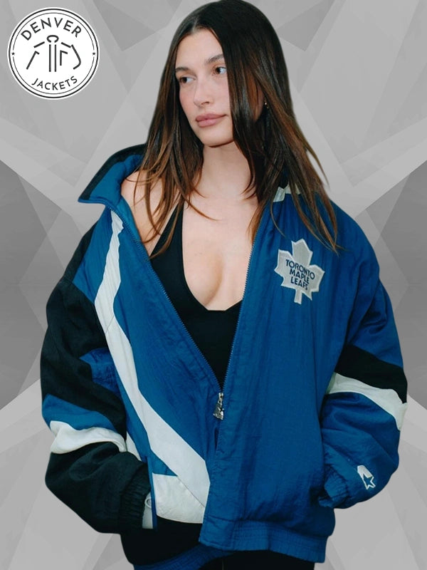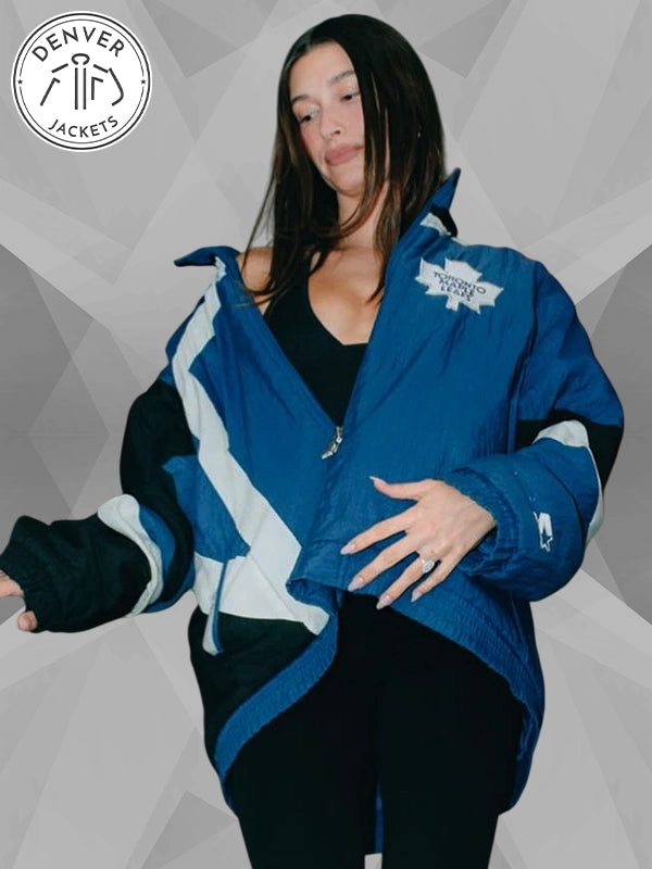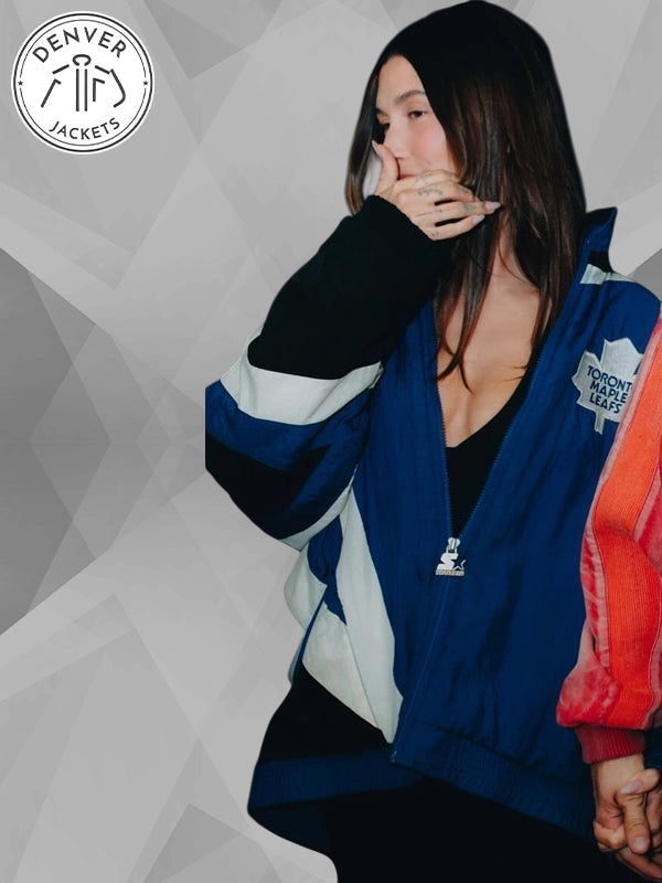 Careful, you might fall in love with the vintage-ness of the Hailey Bieber Toronto Maple Leafs Starter Jacket Blue and get fully immersed with its retro flair. Love it? Great. Order it now from The Denver Jackets Store.