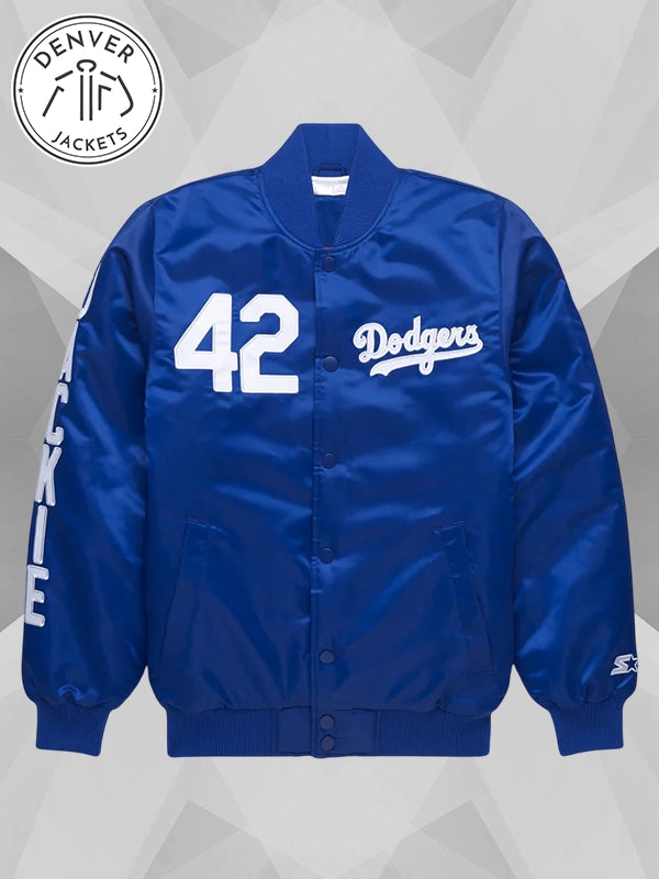Pay homage to the late great legend Jackie Robinson in the form of HOMAGE x Starter Jackie Robinson Satin Jacket and shine on the playfield toting the #42. Order this bomber jacket now from Denver Jackets.