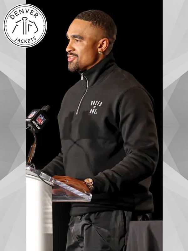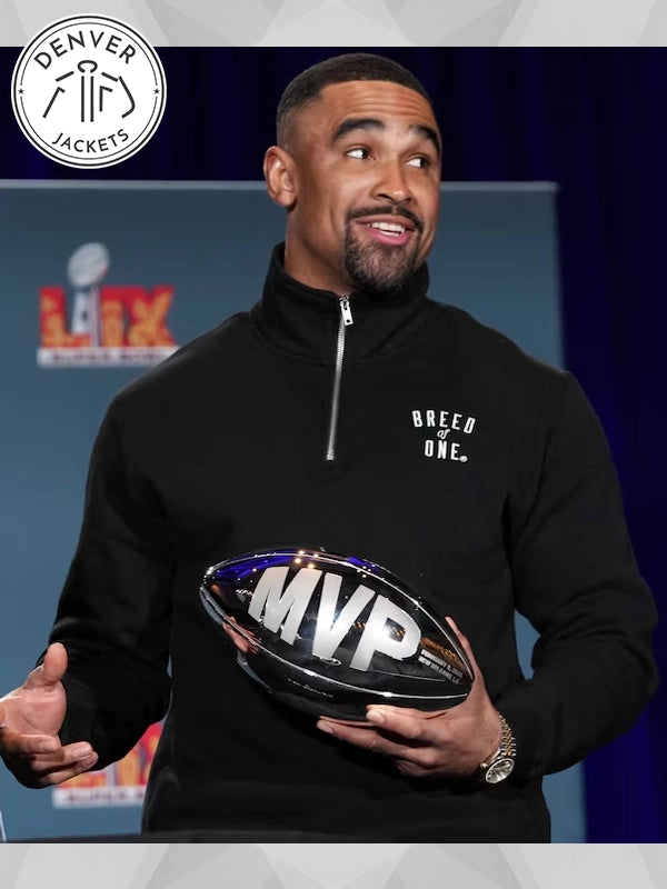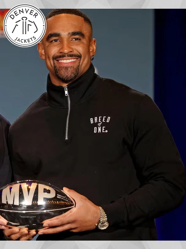 Become the breed of one, one of the best stylists on the radar, with the 2025 Super Bowl LIX MVP Jalen Hurts Breed Of One Black Half Zip Jacket. It is a done-right statement that you need if you represent the GOAT. Order now at Denver Jackets.