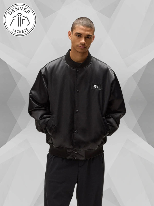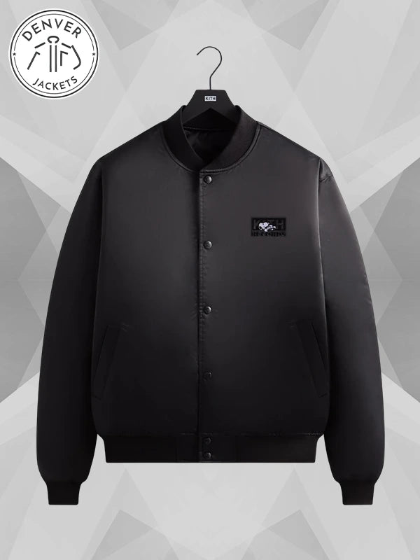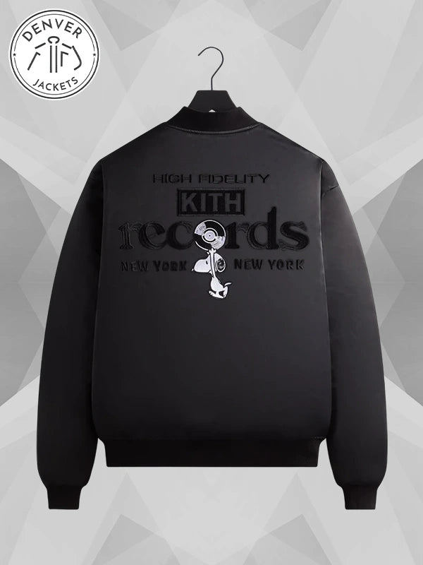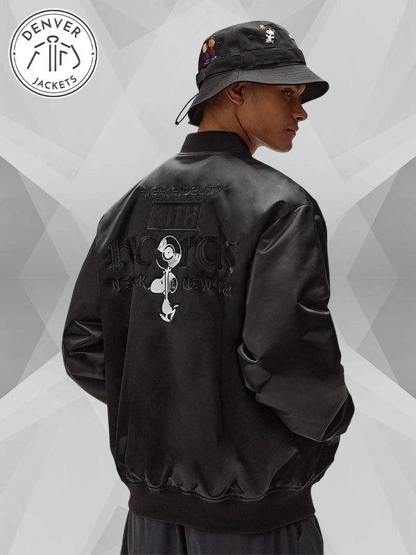 Lean into heartfelt nostalgia with our Kith for Peanuts Satin Bomber Jacket – ‘Black PH.’ Childhood memories are embroidered onto a beautiful satin aviator jacket. Do not miss the opportunity to order it now from The Denver Jackets Store.