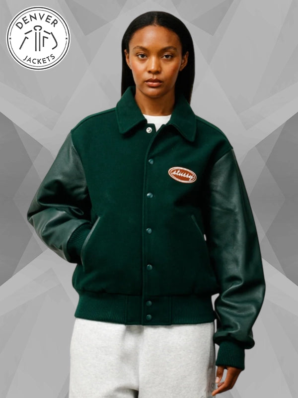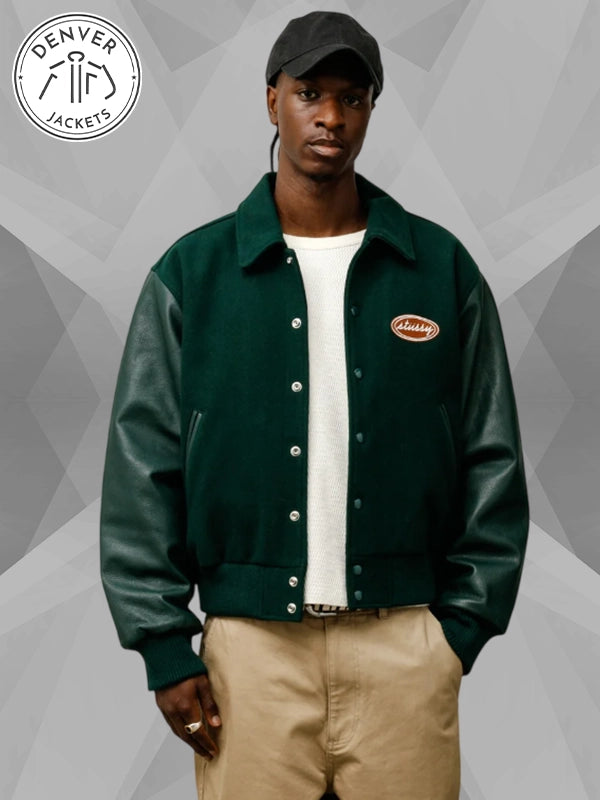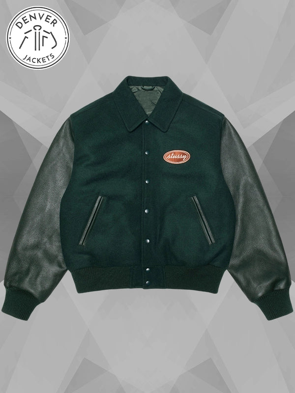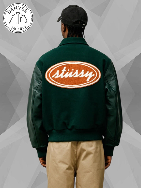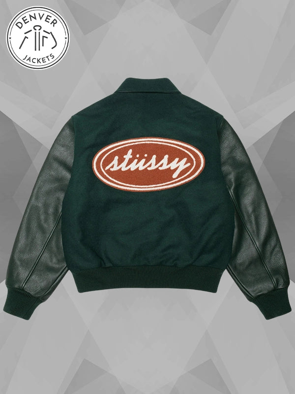 There is something magnetic about a jacket that feels rooted in tradition yet speaks to modern culture. The Stussy Script Oval Varsity Jacket does exactly that, capturing the spirit of varsity heritage while carrying the edge that has always defined Stussy. With its deep green wool body, sleek leather sleeves, and that unmistakable oval patch, it is more than just outerwear; it is a piece of identity.