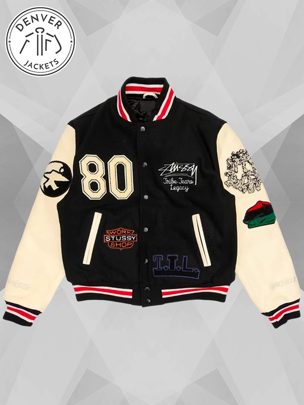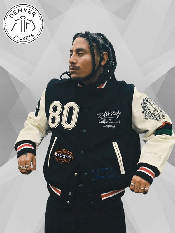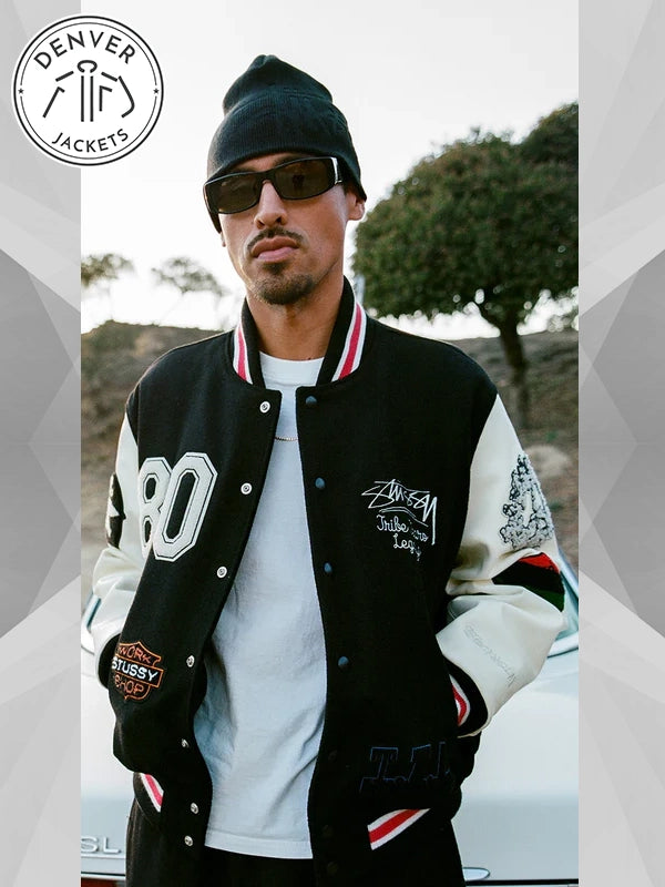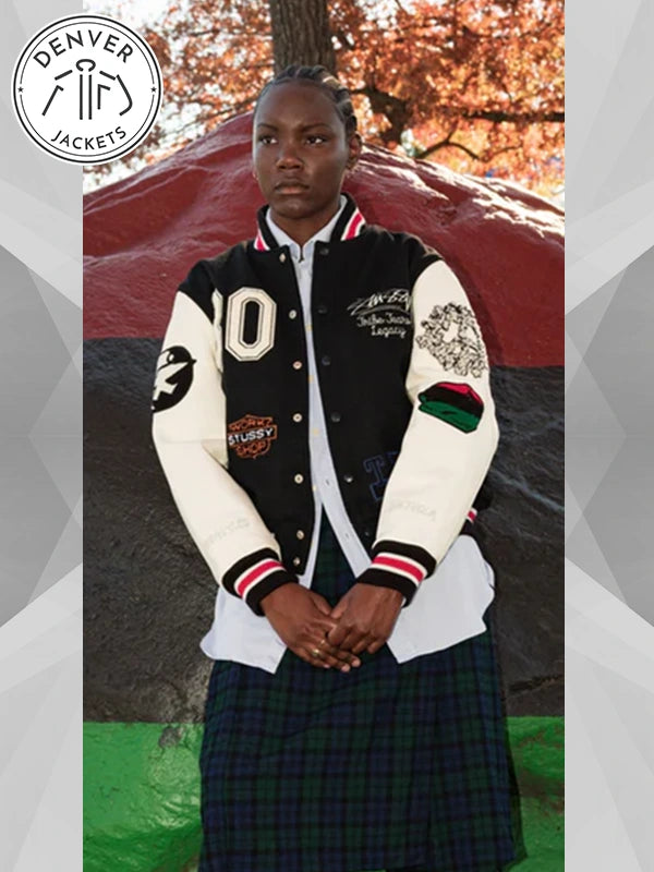 Look out, sophomores! Another heavy-hitter has spawned on the campus. They call him the dude who rocks Stussy x Denim Tears Varsity Jacket Black. So, if you are ready to dial things up with a classy layer, then order it now at Denver Jackets.