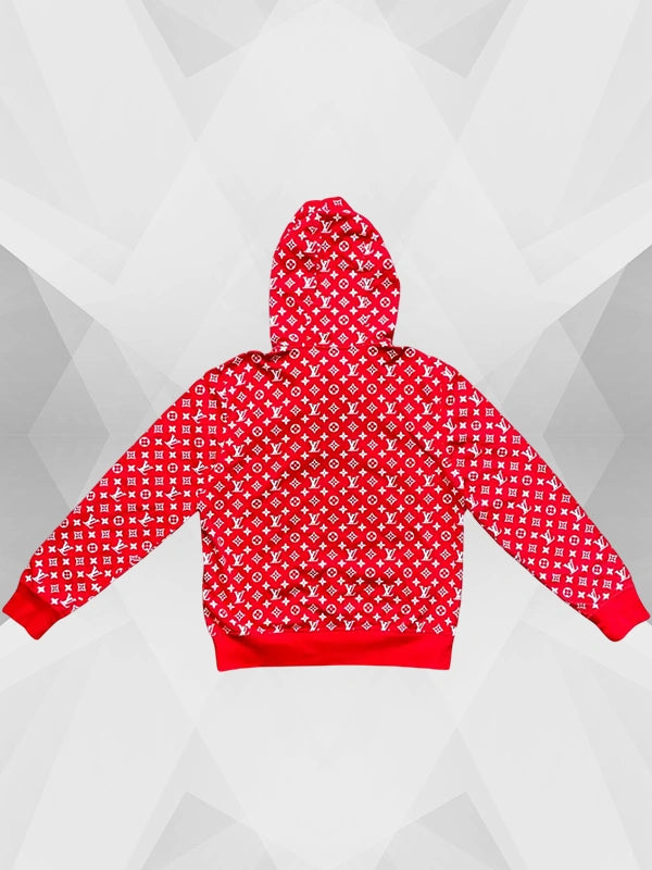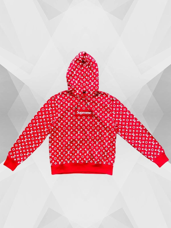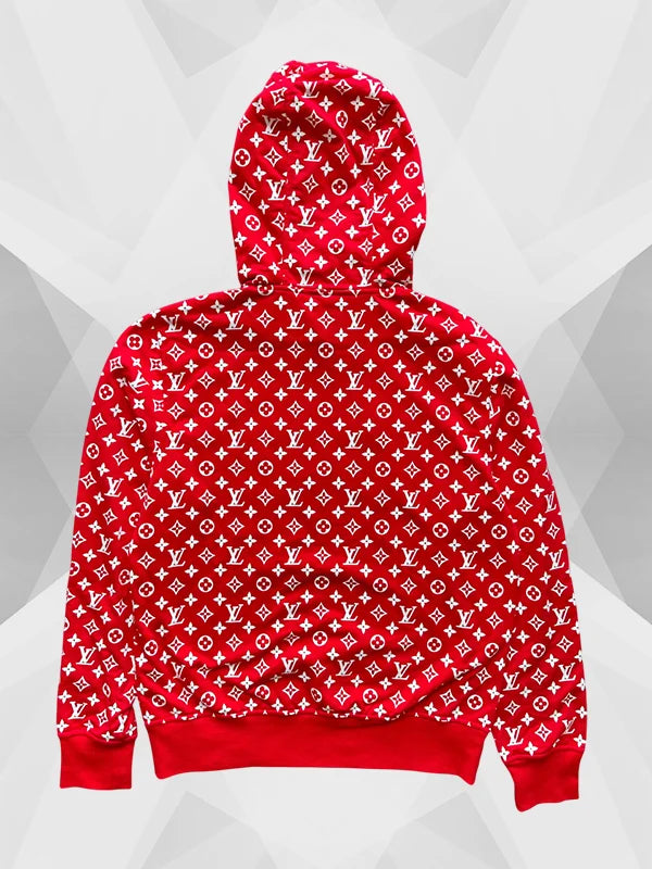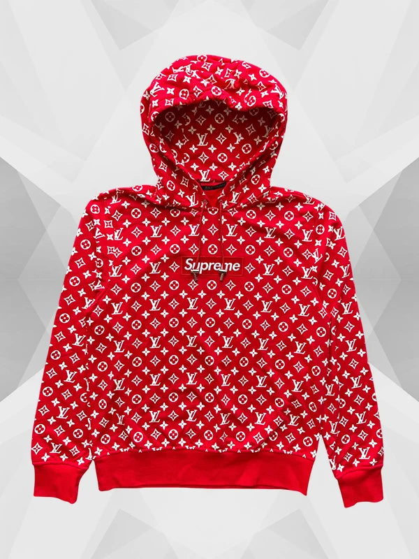 The one Supreme related merch we have in hand today is the red Supreme Louis Vuitton Hoodie. Everybody digs the boxy SUPREME logo, but not everyone gets to wear it with LV.