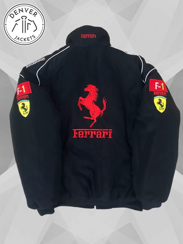 Cotton was utilized in the craftsmanship of this staple which is a very versatile option for the adornments and decorative elements that you can see over this jacket. F1 Shields around the biceps area. Ferrari lettering around the center front in a banner form.